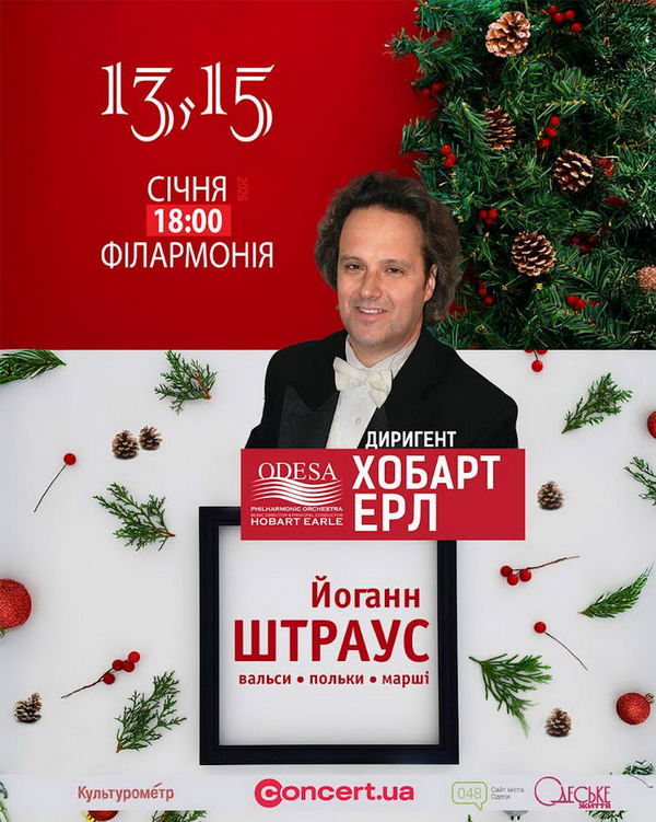 В Одесской филармонии 13 и 15 января в 18:00 в Большом зале Национальный Одесский филармонический оркестр под руководством маэстро Хобарта Эрла сыграет традиционные праздничные концерты музыки ШТРАУСА: ВАЛЬСЫ, ПОЛЬКИ, МАРШИ.В течение многих лет эта традиция получила широкое признание, ведь незабываемые вечера под руководством главного дирижера и художественного руководителя, народного артиста Украины маэстро Хобарта Эрла любят десятки тысяч поклонников.