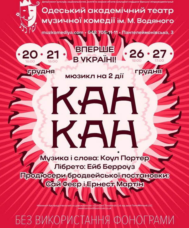 Два уикенда подряд Одесский театр Музкомедии приглашает на премьеру мюзикла «Канкан», впервые на сцене театра Музкомедии, впервые в Одессе, впервые в Украине покажут 20, 21, 26 и 27 декабря. Париж… Конец XIX века… Золотой век расцвета науки, искусства, культуры, архитектуры, автомобилестроения и воздухоплавания… Эпоха модернизма, зарождение радио, кино и кабаре… Мулен Руж только начинает принимать первых гостей, Эйфелева башня еще не стала символом города влюбленных и романтики, а канкан считается в крах.