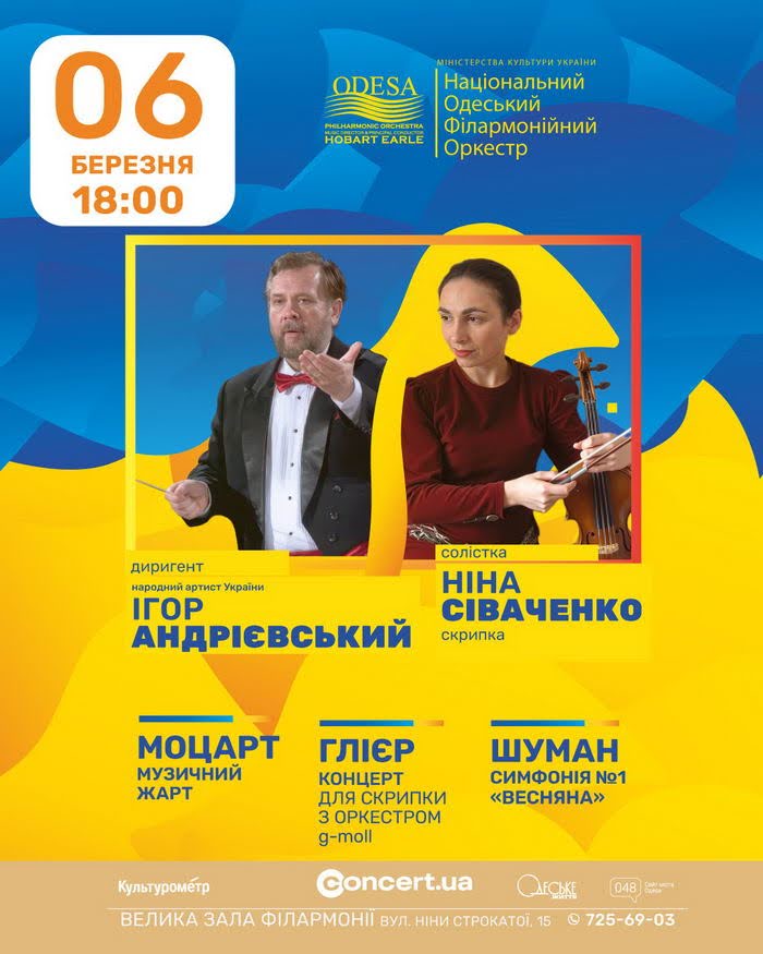 «СИМФОНИЯ ВЕСНЫ» прозвучит в Большом зале Одесской филармонии 6 марта 18:00. Национальный Одесский филармонический оркестр приглашает на концерт «СИМФОНИЯ ВЕСНЫ», в программе которого – блестящий музыкальный юмор Моцарта, романтическая виртуозность Глиера и жизнеутверждающая энергия Шумана.За дирижерским пультом – народный артист Украины, Игорь АндриевскийСолистка – Нина Сиваченко (скрипка).
