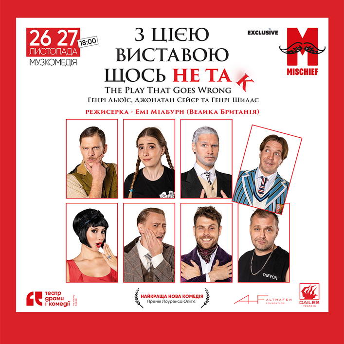 В Одессе на сцене театра Музыкальной комедии 27 и 28 октября состоятся показы спектакля «С этим спектаклем что-то не так» — украиноязычной версии популярной лондонской комедии-франшизы The Play That Goes Wrong. Спектакль создается совместно тремя театрами – Театр на левом берегу (Украина, Киев), Театр Дайлес (Латвия), Mischief (Великобритания).