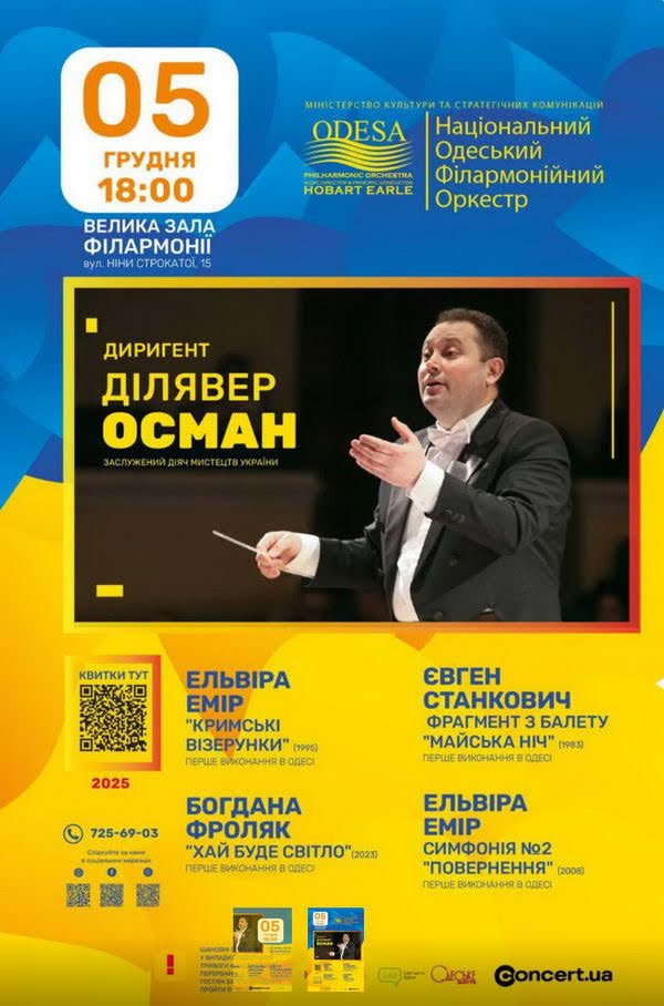 Это будет особый вечер, где музыка будет открывать истории, живущие в нашем общем культурном опыте. Все произведения прозвучат в Одессе впервые! Вечер подарит слушателям новые музыкальные краски и свежие впечатления. За дирижерским пультом — заслуженный деятель искусств Украины Дилявер Осман.