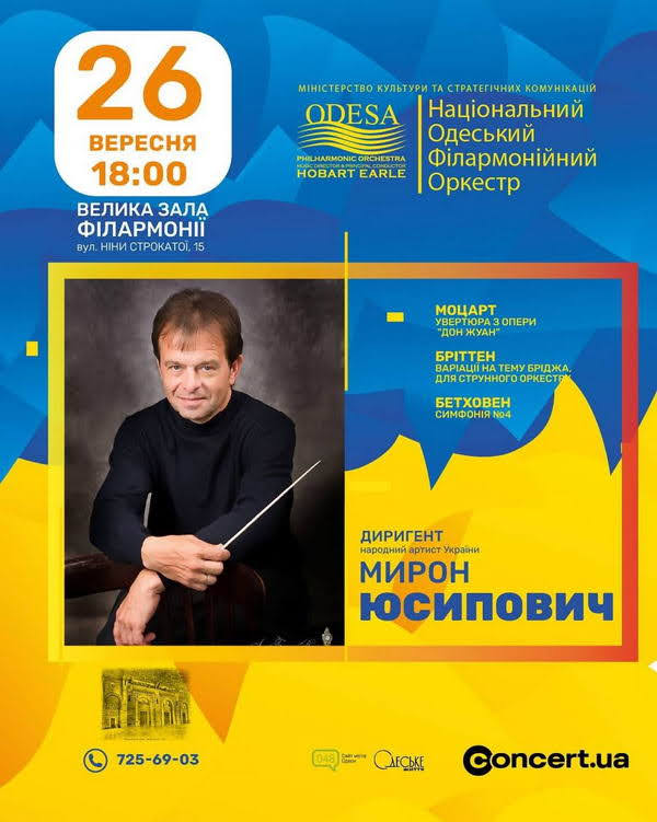 26 сентября в 18.00 Национальный Одесский филармонический оркестр приглашает слушателей в мир величественных музыкальных образов и эмоциональных контрастов. Под руководством народного артиста Украины Мирона Юсиповича прозвучат три шедевра, которые объединяют разные эпохи и стили, но все равно восхищают глубиной и красотой.Программа вечера:🔸• В.А. Моцарт – увертюра к опере «Дон Жуан»Блестящее и драматическое вступление в одну из самых известных опер мира, который сразу погружает слушателя в атмосферу страстей и интриг.