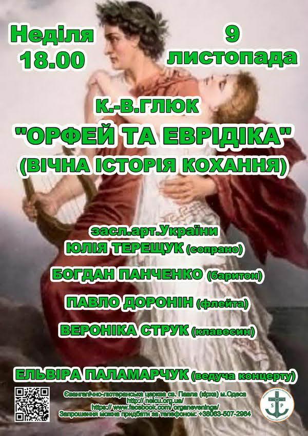 По многочисленным просьбам публики в одесской кирхе сегодня 9 ноября в 18:00 исполнят оперу о вечной истории любви, которая приобретает актуальность сквозь века. Конечно, это Орфей и Эвридика в исполнении любимых музыкантов Одессы. Изюминкой этого концерта в том, что волшебные голоса прозвучат под аккомпанемент клавесина и флейты, артисты будут петь из разных уголков пространства Кирхи.