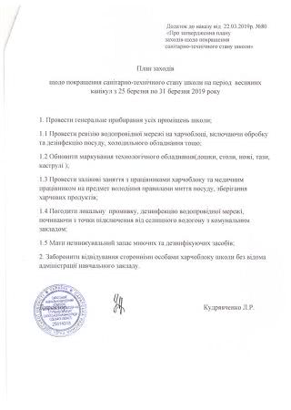 О данном факте было немедленно сообщено в КП «Сарата Комунсервис», также о ситуации был уведомлен Саратский поселковый голова Анатолий Негодяев. 13 марта КП «Сарата Комунсервис» взяло из кранов для мытья посуды в столовой пробы воды. Для профилактики 13 марта и 19 марта года сотрудниками коммунального предприятия была проведено дезинфекция артизианских скважин. В результате из кранов пищеблока вместе с водой выходили микроорганизмы, вода и песок. В целях соблюдения санитарно-технического состояния по школе издан приказ, которым утвержден план мероприятий на период весенних каникул с 25 по 31 марта», — говорится в сообщении.