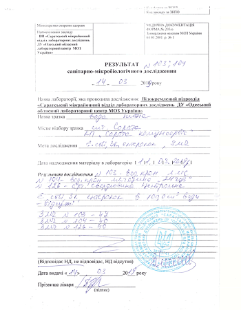 Также указывается, что 25-го марта были отобраны две пробы воды для бактериологического, паразитарного и физико-химического исследования. Результаты исследования показали, что вода соответствует нормам. Но при этом уже 26-го марта сотрудниками КП «Сарата Комунсервис» устанавливаются дополнительные фильтры грубой очистки воды на входе в водоснабжение в столовой и на рукомойник, а также была проведена локальная дезинфекция линии водоснабжения.