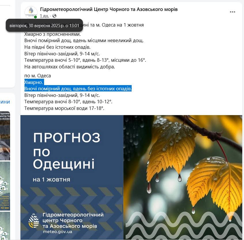 Гидрометеорологический Центр Черного и Азовского морей 30 сентября не предупредил об опасности и мощном ливне. Мы проанализировали страницу учреждения в Фейсбуке и заметили, что в обед 30 сентября в 13:00 была публикация, что существенных осадков не прогнозируется. Лишь ночью ожидается умеренный дождь.Это очень удивило одесситов, потому что все западные сервисы аналитики и прогнозирование погоды свидетельствовали об очень мощном ливне еще утром.