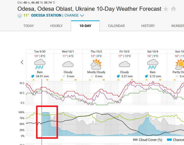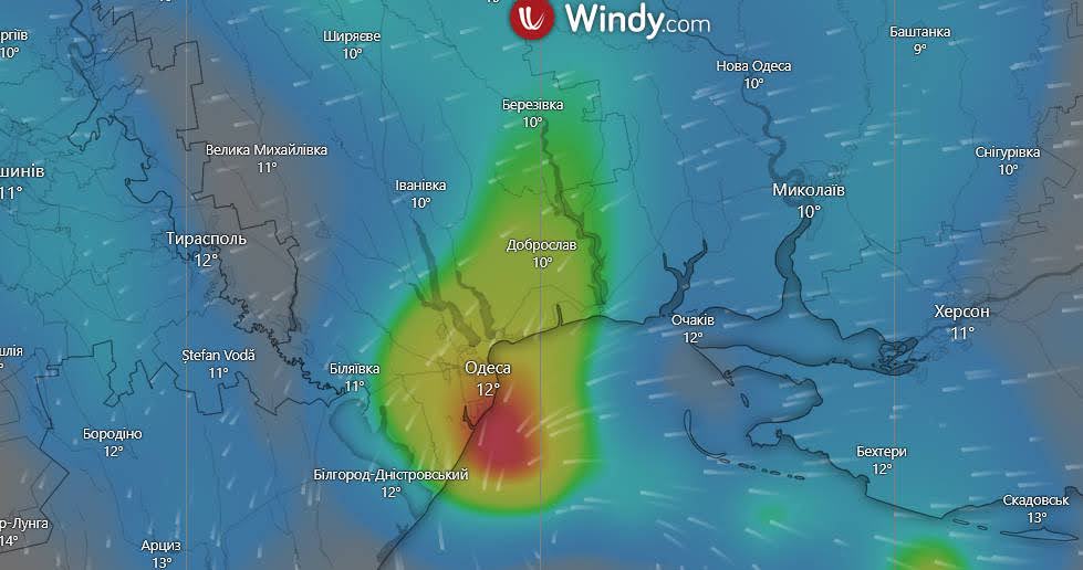 В 12:00 сервисы прогнозы погоды показывали очень мощный ливень в Одессе.