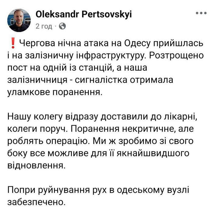 Под утро враг нанес удары по железнодорожному посту в пределах Одессы и уничтожил его. Ранение получила железнодорожница-сигналистка, сообщил Александр Перцовский, председатель правления Укрзализныци. Ее госпитализировали и делают операцию.