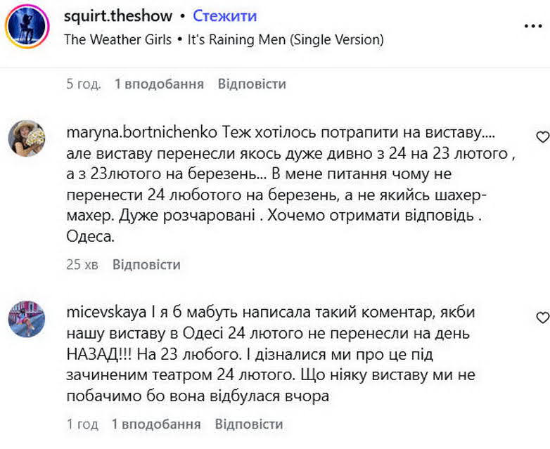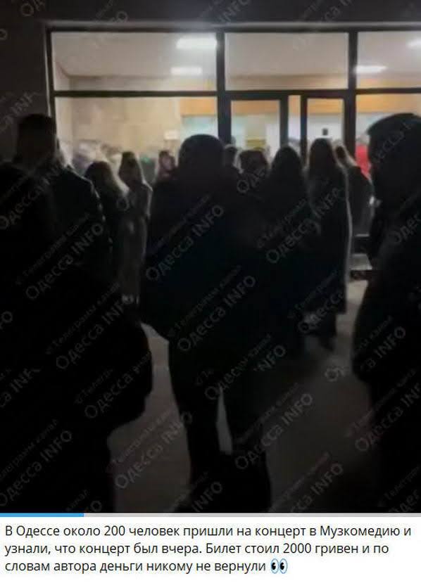 Но получилось так, что почти никто из зрителей о переносе не знал, а сам перенос выглядит очень странно. Выступление с 24 февраля было перенесено на 23 февраля, а с 23 февраля на 11 марта. Логично было бы перенести с 24 февраля на 11 марта, но нет. Одесситки в соцсетях пишут, что билеты стоили по 2000 грн и теперь никто не хочет возвращать деньги за испорченный вечер.