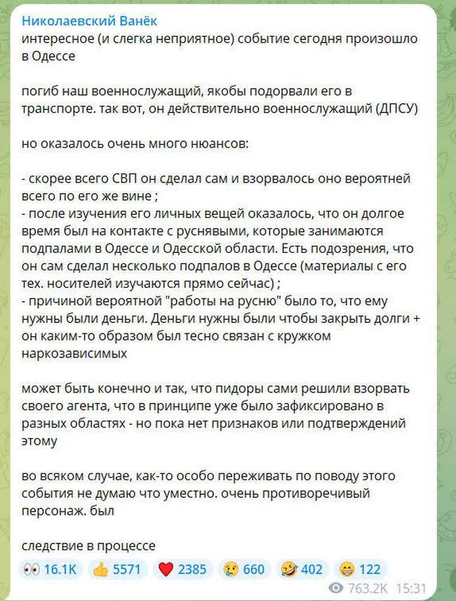 Неофициальные источники начали постепенно сообщать подробности взрыва в Одессе сегодня 6 февраля, во время которого погиб 21-летний мужчина. Так телеграмм-канал «Николаевский ванёк», связанный с украинской разведкой и ПВО сообщил, что погиб военнослужащий — пограничник.Фото: «Суспільне»Взрывное устройство он сам положил в салон и оно было самодельным. Одна из версий полиции выглядит так, что пограничник самостоятельно сделал бомбу, чтобы заложить ее, но она сдетонировала раньше.