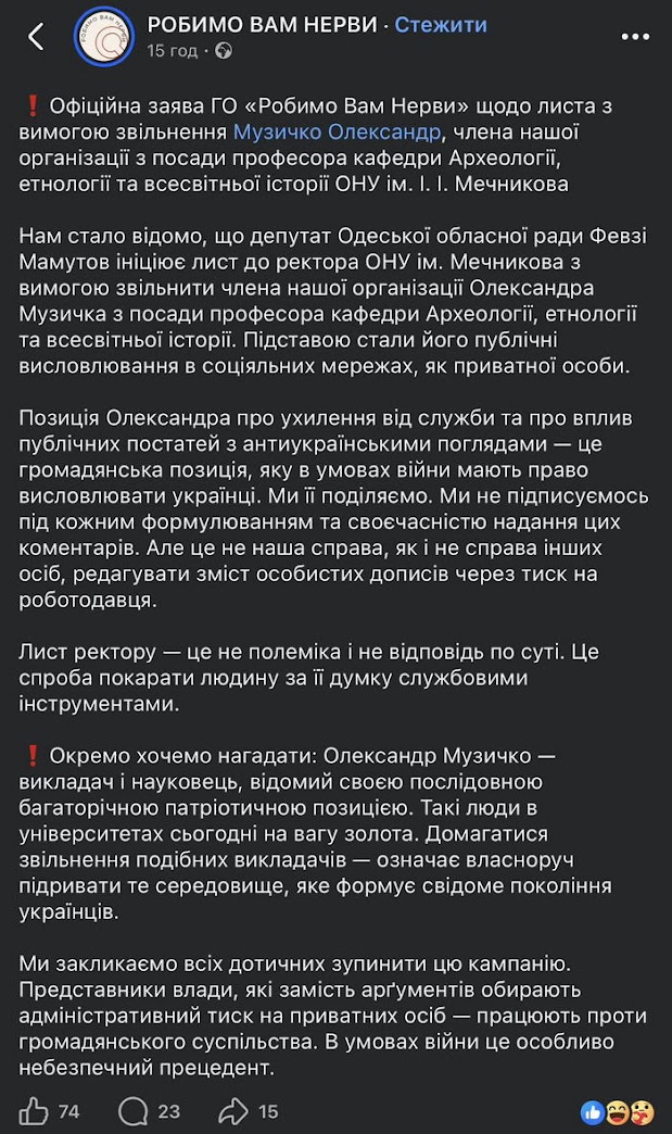 В ОО «Делаем вам нервы» встали в защиту Александра Музычко — там заявили, что все высказывания автора частные и не касаются его работы в университете. А служебная проверка в университете – это «попытка наказать человека по его мнению». Напомним, что одиозный Александр Музычко ранее делал резки заявления по поводу военных, говорящих на русском языке.