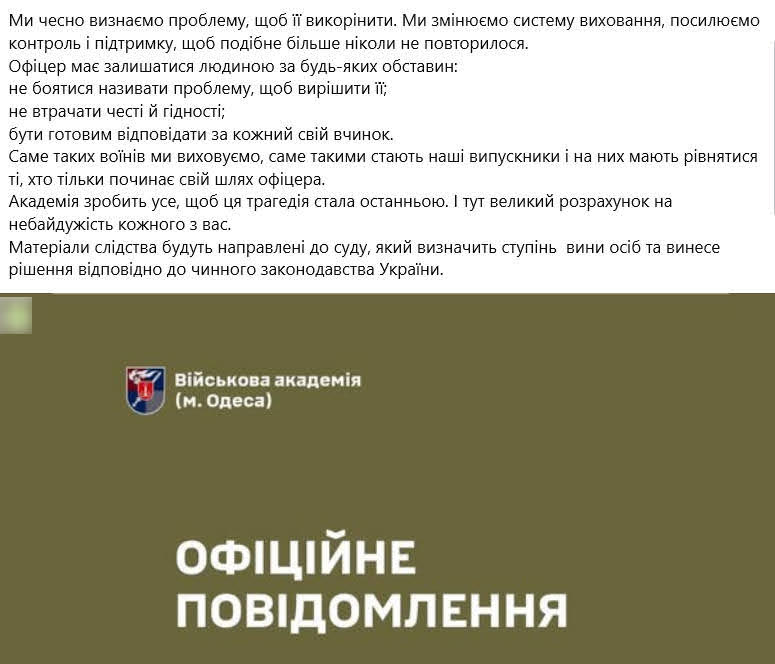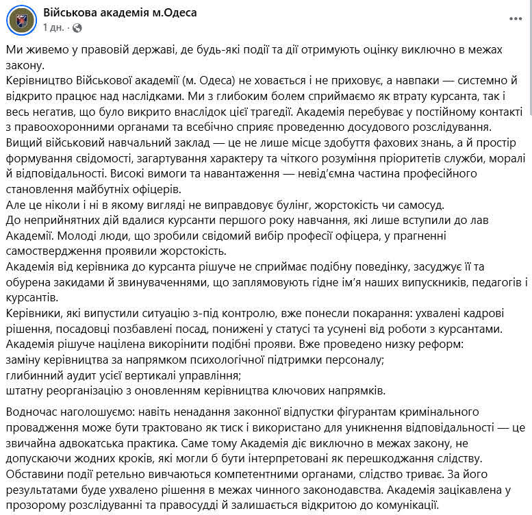 В Одесской военной академии сообщили, что официально не было никаких жалоб или сообщений на анонимный «Ящик доверия»: «Академия находится в постоянном контакте с правоохранительными органами и всемерно способствует проведению досудебного расследования. Высшее военное учебное заведение — это не только место получения профессиональных знаний, но и пространство формирования сознания, закаливания характера и понимания приоритетов службы, морали и ответственности. Молодые люди, сделавшие сознательный выбор профессии офицера, в стремлении к самоутверждению проявили жестокость. Руководители, выпустившие ситуацию из-под контроля, уже понесли наказание: приняты кадровые решения, должностные лица лишены должностей, понижены в статусе и отстранены от работы с курсантами. Уже проведен ряд реформ: — замену руководства по направлению психологической поддержки персонала; глубинный аудит всей вертикали управления; штатную реорганизацию с обновлением руководства ключевых направлений.