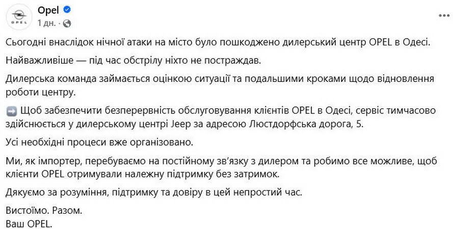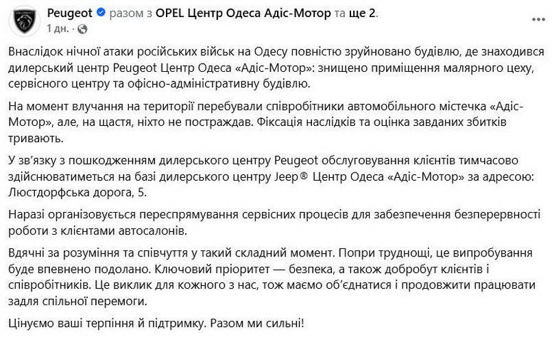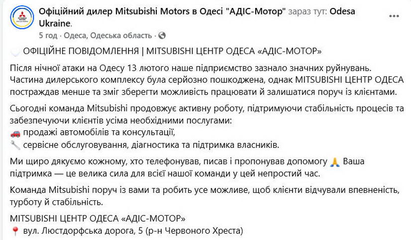В ночь на 13 февраля в Одессе впервые серьезно пострадали дилеры новых автомобилей — под ударами России оказались сразу 4 автосалона на Люстдорфской дороге, 5, которые продавали и обслуживали автомобили Peugeot, Mitsubishi, Opel и Subaru. Уничтожены десятки новеньких автомобилей, административные здания, станции технического обслуживания. К счастью, персонал дилерских центров не пострадал.