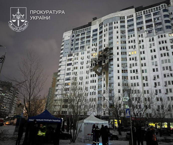 Россия продолжает свои военные преступления – безнаказанно убивает мирных жителей Украины и разрушает жилые дома без всякого присутствия военных целей. Так минувшей ночью 9 января произошла очередная массированная атака по Киеву. Как сообщили в Офисе генерального прокурора, погибли 4 человека, 25 пострадали. Среди погибших — работник скорой помощи, приехавшей спасать раненых и в это время российские террористы ударили повторно «шахедом».