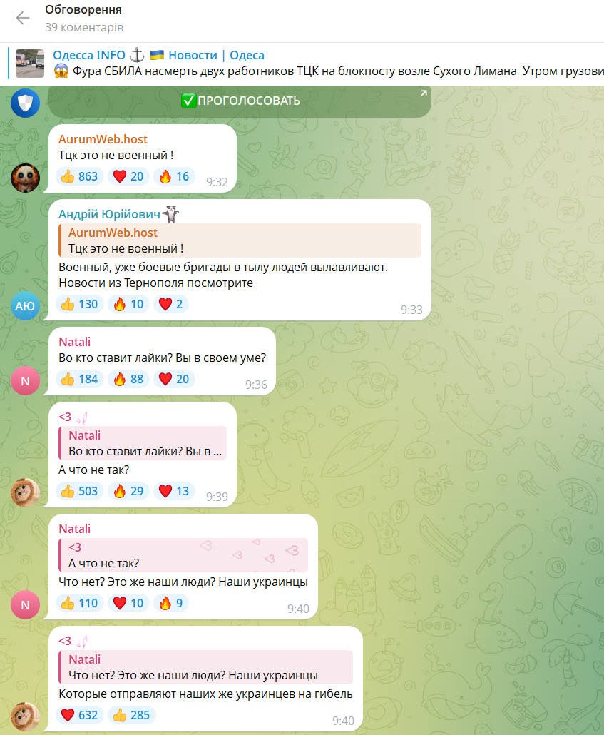 Также сверху очень быстро были оставлены десятки комментариев, в которых выражали радость от гибели военнослужащих и оскверняли их достоинство. Эти отвратительные комментарии получили сотни положительных реакций. Эта спланированная информационная диверсия направлена на формирование агрессивного отношения к военнослужащим, работающим во время мобилизационных уведомлений. Цель российских информационных войск – максимальная «демонизация» ТЦК и в дальнейшем срыв мобилизации. Недостаточность мужчин в армии может привести к поражению в войне и оккупации очень больших территорий и разрушениям городов.