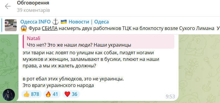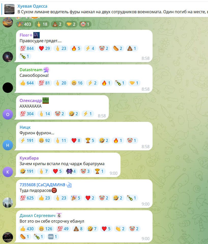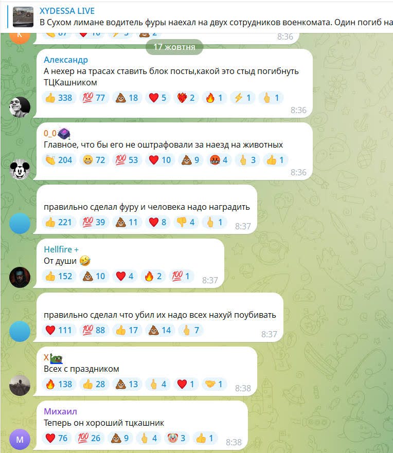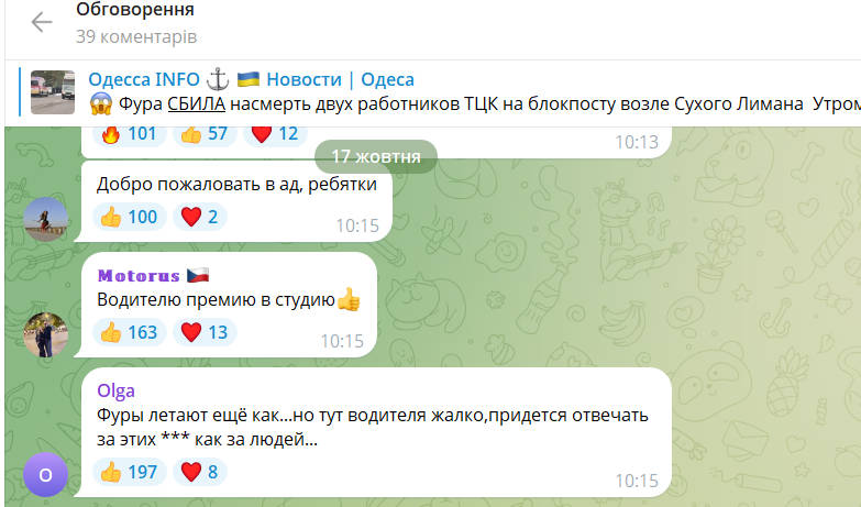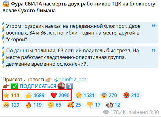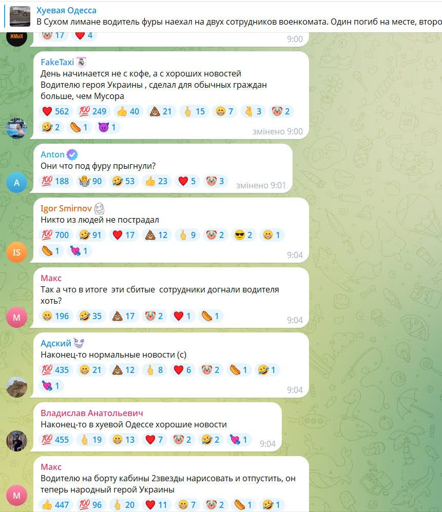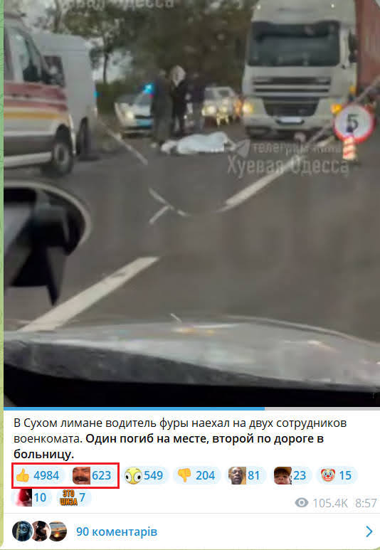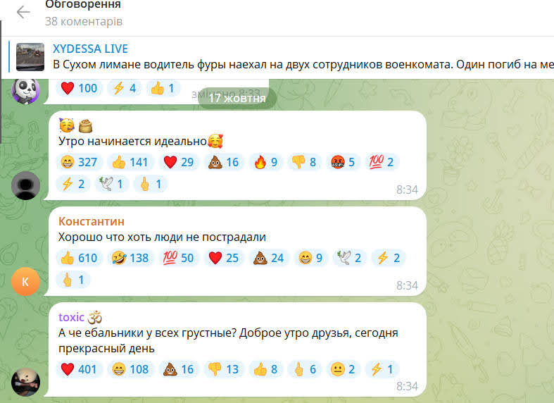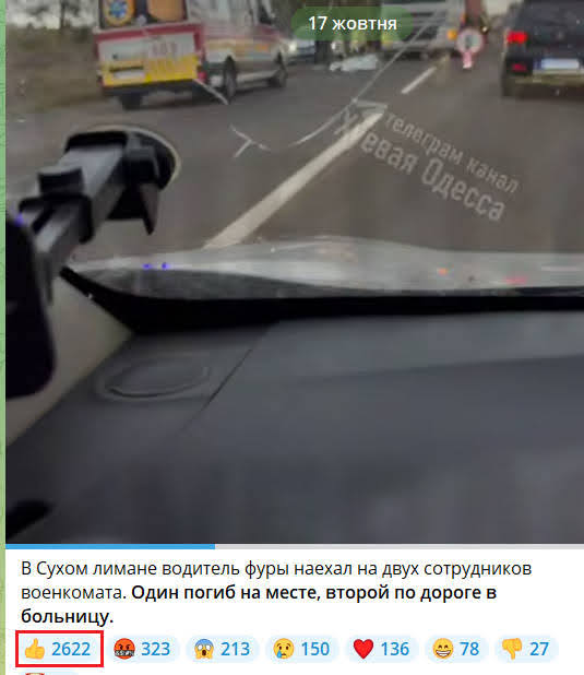 Вчера 17 октября на трассе возле Сухого Лимана в ДТП погибли два военнослужащих, которые несли службу на передвижном блокпосте. Водитель грузовика не остановился и наехал на военнослужащих, погибших от травм до приезда медиков. Им было 34 и 36 лет. После публикации новости на одесских информационных ресурсах, в трех одесских телеграмм-каналах — «Хуевая Одесса», «XYDESSA LIVE» и «Одесса INFO» состоялась информационная российская диверсия.