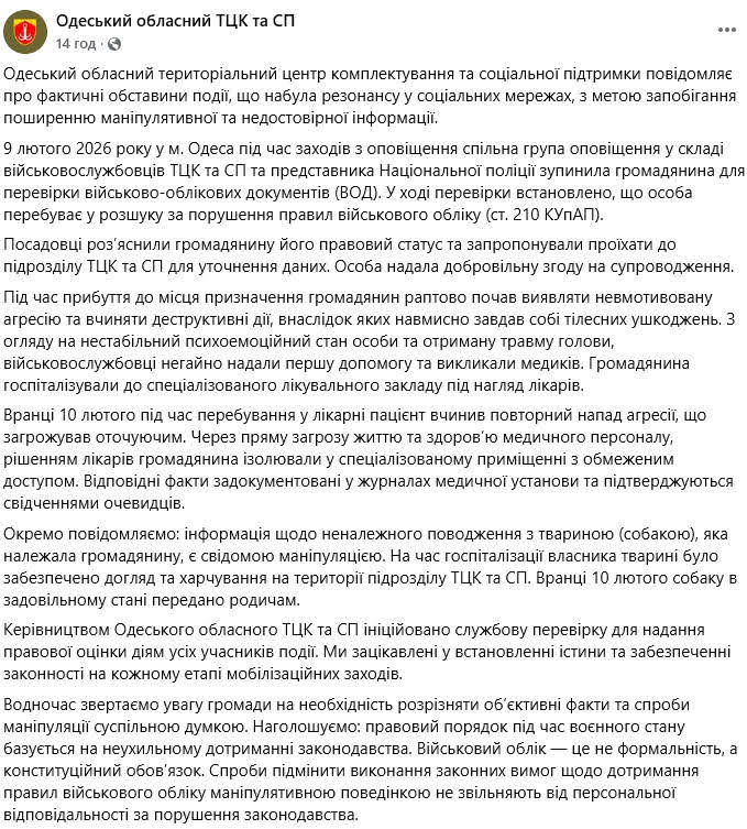 В Одесском ТЦК сообщили свою точку зрения. По их данным, мужчина добровольно согласился уехать в ТЦК, чтобы уточнить свои данные. Уже в центре комплектования начал проявлять агрессию и нанес себе самоувечье. Учитывая нестабильное психоэмоциональное состояние личности и полученную травму головы, военнослужащие немедленно оказали первую помощь и вызвали медиков. Гражданин госпитализирован в специализированное лечебное учреждение под наблюдение врачей.